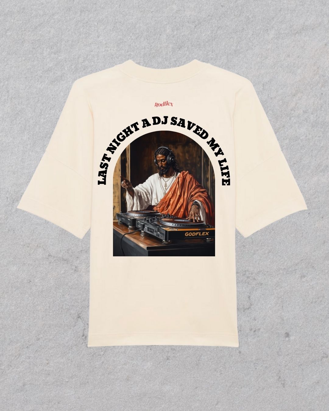 This T-shirt shows DJ Jesus deep in the mix in a Renaissance art style. Using our signature GODLFEX GDX10 Controller.